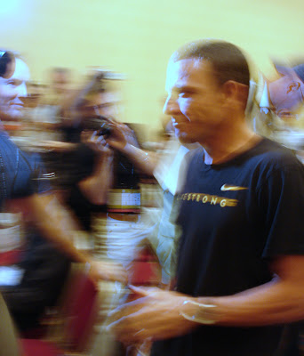 My best photo of the Press Conference this morning… pretty much sums up the whirlwind of media all vying for a shot of the Livestrong superhero.