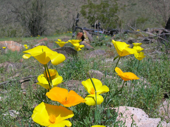 I rode the Gila trail yesterday and checked out the two newly cut trails. The Marker 33 trail appears to be done now, as there were both bikes and hikes coming down it. The other one (on the southernmost ridge line) is still under construction — the trail machine was up top where the work stopped. The wildflowers were in full bloom, especially in the hidden valley were the Gila trail connects up with National.